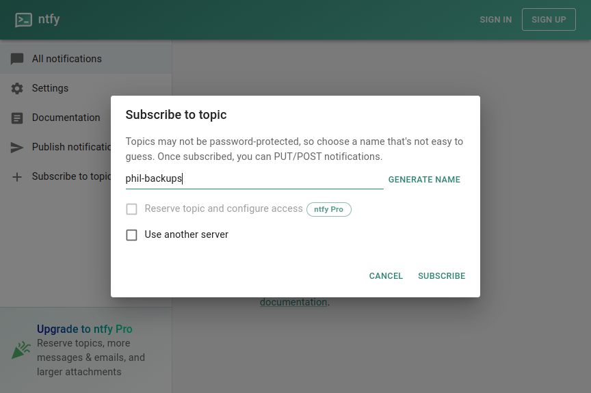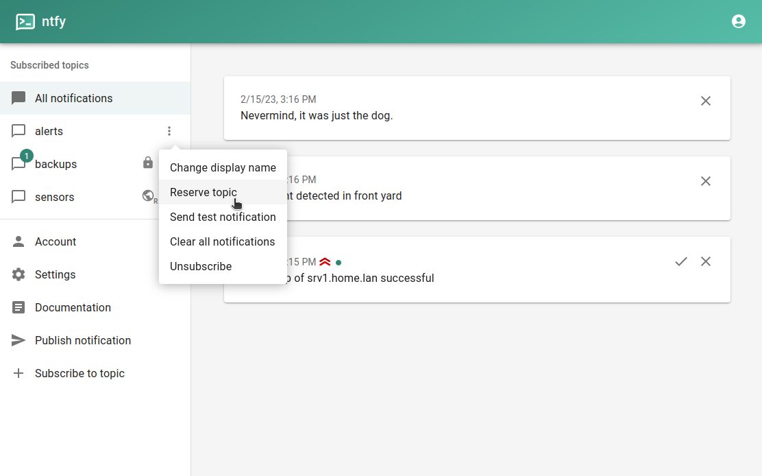 The web app lets you subscribe and publish messages to ntfy topics. For ntfy.sh, the web app is available at ntfy.sh/app. To subscribe, simply type in the topic name and click the Subscribe button. After subscribing, messages published to the topic will appear in the web app, and pop up as a notification.